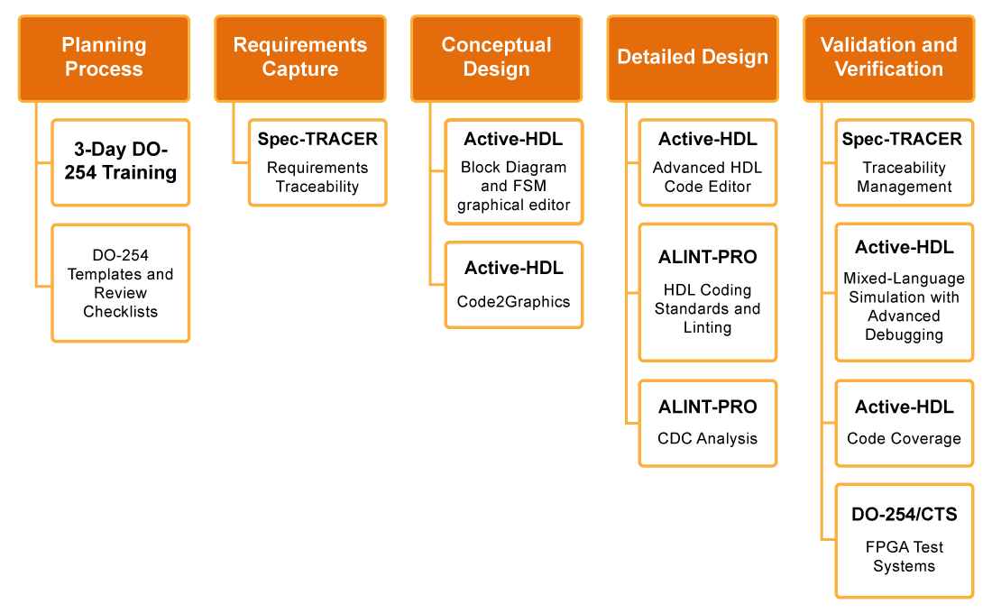 DO-254 Compliance RTCA/DO-254 is a means of compliance for the development of airborne electronic hardware containing FPGAs, PLDs and ASICs. FPGA design and verification under DO-254 guidelines is a rigorous undertaking, and requires special features and capabilities from design, simulation and hardware verification tools. The Federal Aviation Administration (FAA) and other international certification authorities recognize the use of commonly used tools for FPGA design and verification such as RTL Simulator, Synthesis, Place & Route and Static Timing Analysis. For DAL A and B FPGAs, the FAA also recognizes other tools that improve design, verification, traceability and project management including Requirements Management, Traceability, Tests Management, Design Rule Checker, Clock Domain Crossings (CDC) Analysis, Code Coverage and FPGA Physical Test Systems. Aldec’s Aldec’s specialized tools for design and verification of FPGAs boost productivity and help applicants achieve DO-254 compliance: ALINT-PRO, Active-HDL and DO-254/CTS. Aldec’s tools have been implemented and deployed by several major avionics companies, accepted by certification authorities, and proven to decrease FPGA design and verification cycle from months to weeks.