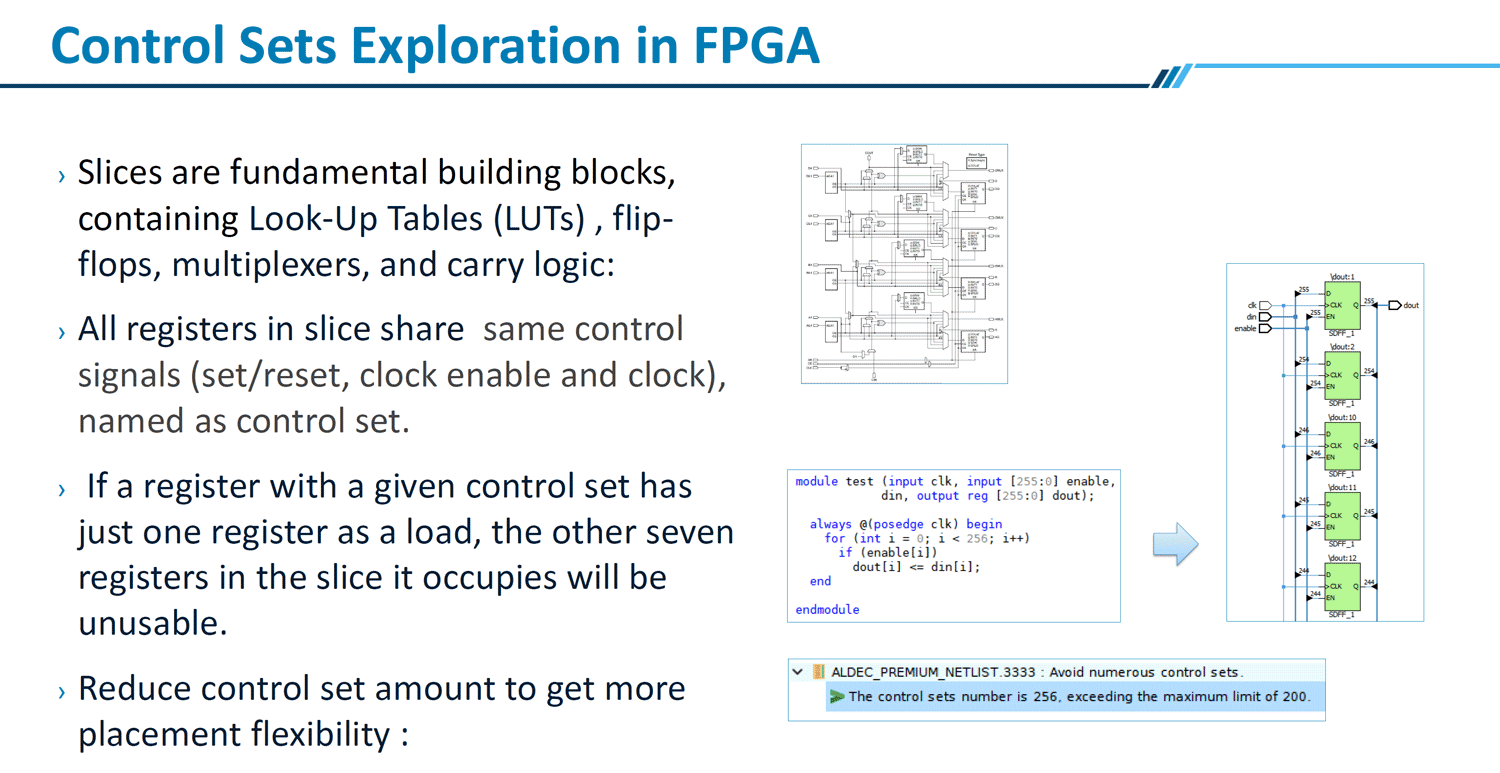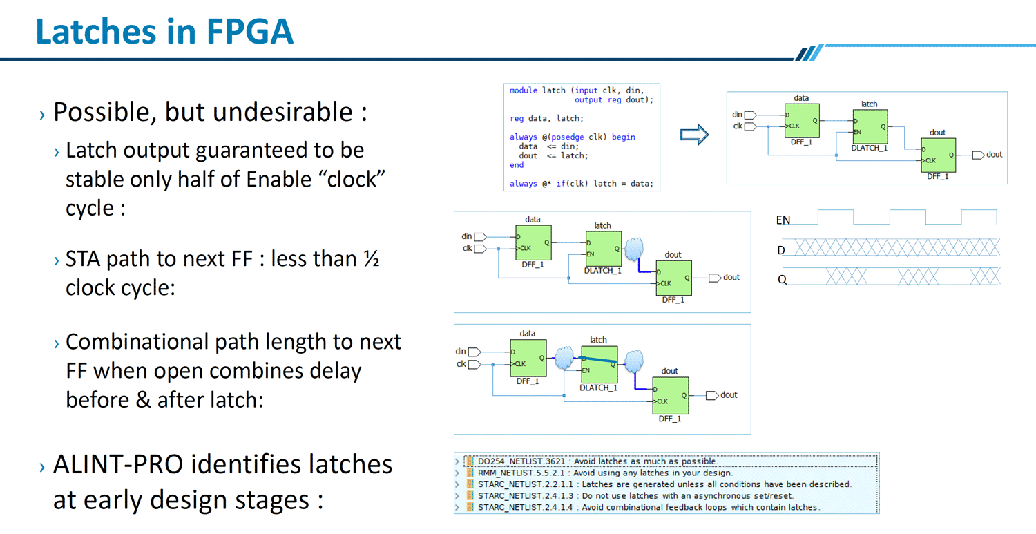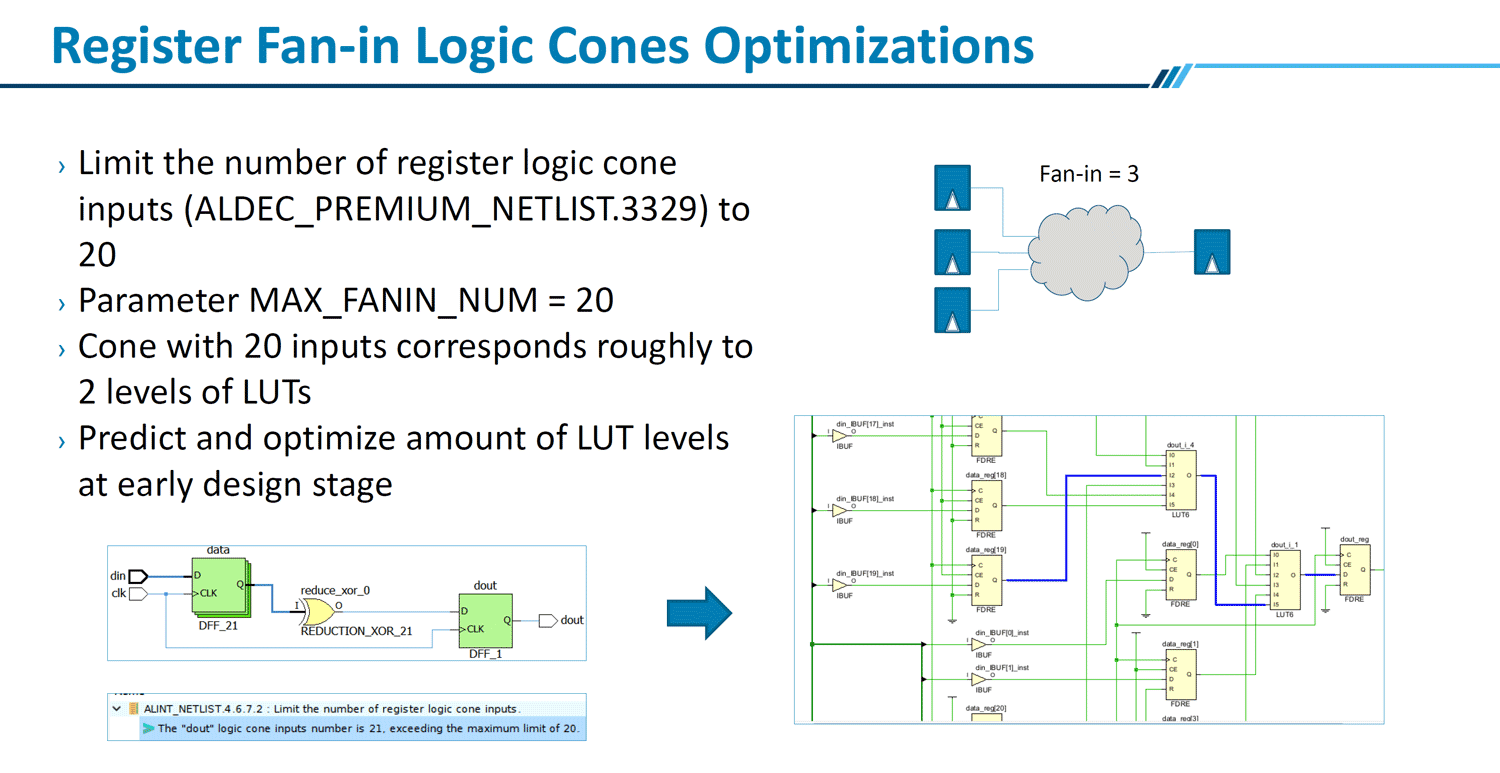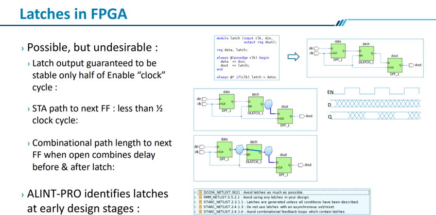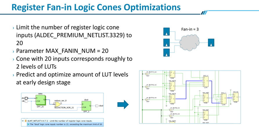 Advanced Static Linting for FPGA Performance Optimization How to Boost Design Speed and Efficiency Aldec, Technical Marketing Team Like(0) Comments (0) Accelerate FPGA Design with Advanced Static Linting In modern high-speed FPGA design, raw performance isn’t enough. Engineers face increasing challenges in achieving higher clock frequencies, lower power consumption, and smaller silicon footprints — all while maintaining strict design reliability. The key to mastering these challenges lies in early-stage static linting. Advanced linting tools such as ALINT-PRO allow design teams to analyze HDL code for performance, timing, and synthesis readiness before simulation or implementation even begins. Static linting is an automated HDL code analysis technique that detects hidden design issues without simulation. It validates Verilog, VHDL, or mixed-language designs against hundreds of best-practice rules, ensuring RTL code meets both functional and performance objectives. With advanced linting, engineers can detect coding inefficiencies early in the design cycle, verify clock and reset correctness, identify long combinational paths before synthesis, and improve timing closure and implementation predictability. Static linting isn’t just for code quality — it’s a performance enabler. Waiting until synthesis to optimize performance is costly. By integrating linting at the RTL development stage, engineers can detect inefficiencies, logic hazards, and architecture flaws that otherwise surface much later during place-and-route or static timing analysis. Early linting accelerates timing closure, reduces implementation runtime, improves power efficiency and area utilization, and increases design confidence before simulation. FPGA-Specific Rule Sets: Precision Optimization for Programmable Logic Traditional linting focuses on syntax and coding style. FPGA-specific rule sets, however, are engineered to target architecture-aware performance bottlenecks, resource inefficiencies, and timing sensitivities unique to programmable logic. Below are the most impactful categories of FPGA-specific rules implemented in modern linting tools like ALINT-PRO. 1. Clock Enable Optimization vs. Clock GatingConventional clock gating can introduce skew and timing violations in FPGAs. FPGA-specific linting rules now enforce clock enable logic instead, fully aligned with recommendations from major FPGA vendors. This results in lower power, cleaner clock trees, and safer timing across domains. 2. Register Fan-In and Control Set EfficiencyEach slice in an FPGA has limited input and control signal capacity. Exceeding register fan-in thresholds leads to longer logic chains and routing congestion. Advanced linting tools automatically flag excessive fan-in and analyze control set utilization, identifying designs that overuse unique resets, enables, or clocks. This ensures efficient resource packing and improved timing margins. 3. Arithmetic and Resource Mapping OptimizationModern FPGAs include dedicated DSP slices, multipliers, and logic blocks. FPGA-specific linting checks ensure arithmetic operations are coded to infer hardware DSP blocks efficiently, using correct bit widths, pipeline depths, and operand structures. This leads to optimized mapping to DSP resources, reduced LUT count, and faster timing closure. 4. Latch Elimination for Stable TimingUnintended latch inference remains one of the most common HDL pitfalls. FPGA-specific linting detects latches created by incomplete conditions in if or case statements, ensuring all paths are explicitly registered. This provides deterministic timing analysis, glitch-free signals, and predictable synthesis results. 5. Technology Optimization AwarenessEven before synthesis, linting can estimate logic depth and combinational path length. By analyzing these soft timing indicators, designers can predict potential bottlenecks in high-frequency designs and adjust logic partitioning or pipelining strategies accordingly. This gives early visibility into timing-critical paths without full implementation. 6. Control Set and Logic Utilization BalanceFPGA-specific rules also analyze how registers share control signals. If too many unique control sets exist, slice utilization drops dramatically, wasting valuable FPGA fabric. Linting highlights these cases early, allowing designers to consolidate control logic for more compact, performance-optimized resource usage. The latest generation of static linting tools extends beyond syntax validation. By combining FPGA-awareness, constraint propagation, and architecture-based checks, engineers can achieve timing-aware static analysis, technology-independent synthesis evaluation, structural optimization before placement, and configurable rule tagging for goal-specific runs. These capabilities make linting not just a verification tool but a design optimization platform. Real-world RTL designs show how static linting converts nested if-else chains into efficient case statements, detects long combinational feedback loops, reveals resource-sharing opportunities, and identifies unregistered I/O and CDC violations early in RTL. These examples demonstrate how FPGA-specific rule sets in ALINT-PRO translate into faster, safer, and more efficient FPGA implementations.Early linting is now a best practice for achieving timing, power, and area goals in FPGA projects. By adopting FPGA-specific rule sets, design teams can achieve faster timing closure cycles, fewer synthesis iterations, and noticeable reductions in power and area utilization. Linting has evolved from a coding hygiene step into a critical phase of design optimization. Watch the Webinar: Advanced Static Linting Techniques for High-Performance Design Optimization See the techniques, live demonstrations, and rule-based performance strategies in action. Watch the full webinar to explore these insights further. For additional resources and a free trial of ALINT-PRO, visit www.aldec.com/products or contact